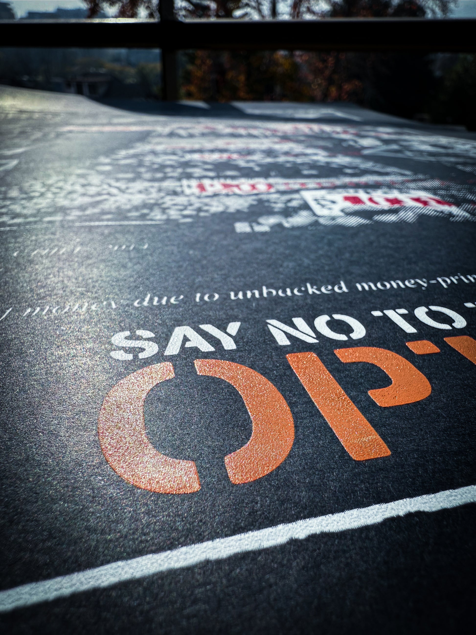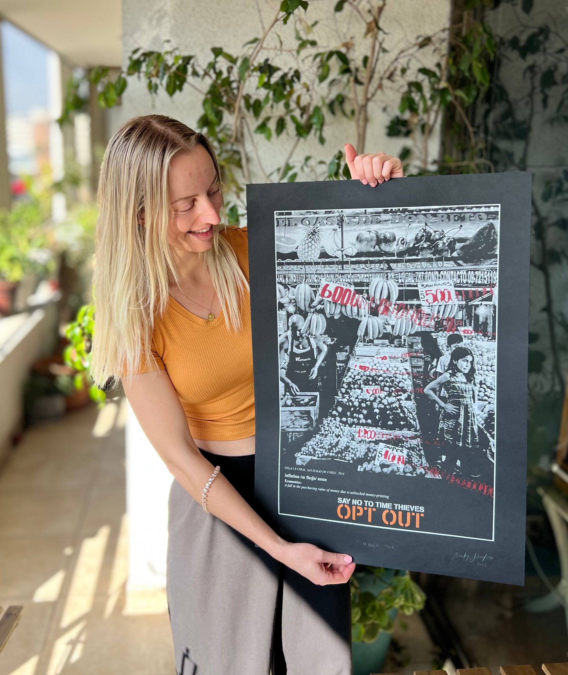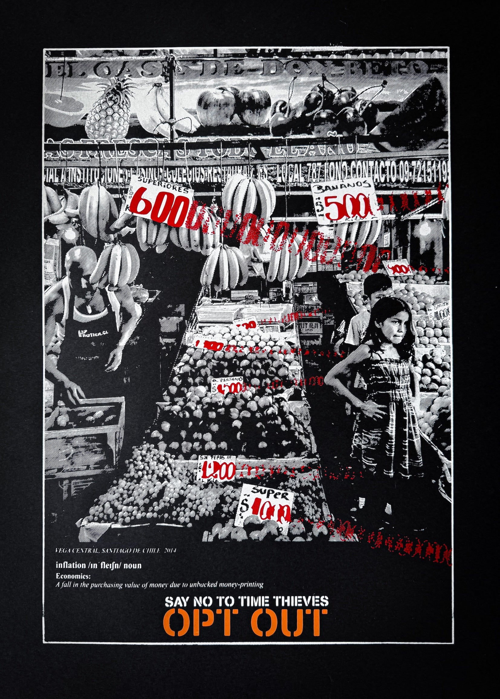Accompanying the image is a playful yet ironic text in which the artist offers her own definition of the word “inflation,” in a tone that is accessible yet critical. Finally, the top layer in bright orange acts as a call to action: OPT OUT. The piece moves from critique to possibility. It invites the viewer to consider an alternative to this “hidden tax”: Bitcoin.