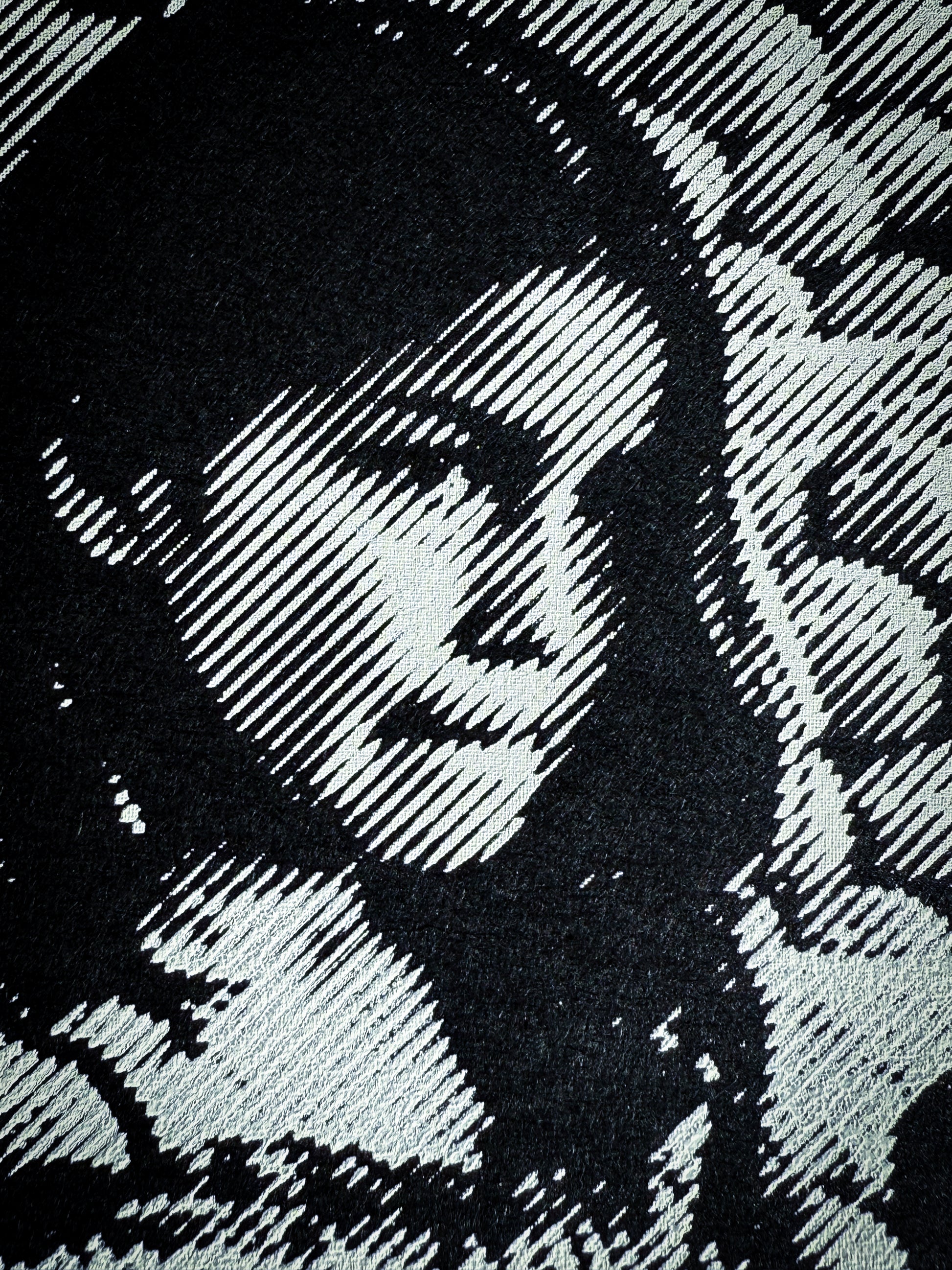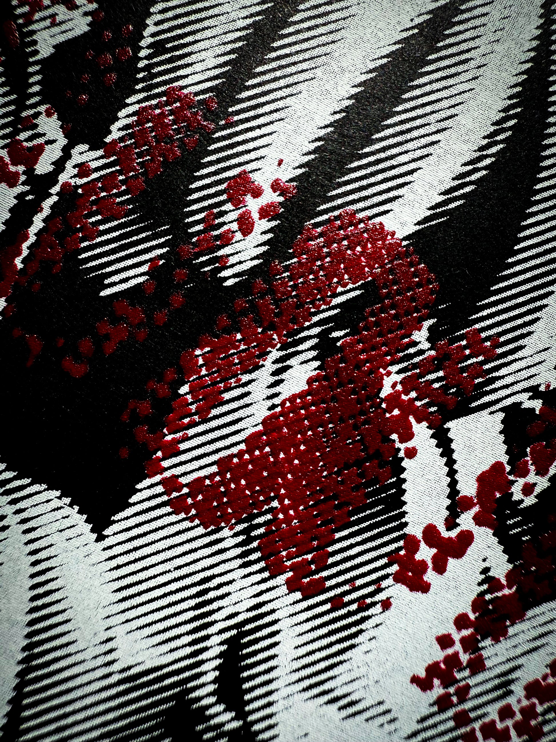 Visually, the work is built through three layers of color (white, red, and orange), screen-printed on black paper. Through a careful play of textures and patterns, the artist lifts a figurative image from near abstraction, achieving a balance between aesthetic appeal and the rebellious message at its core.
