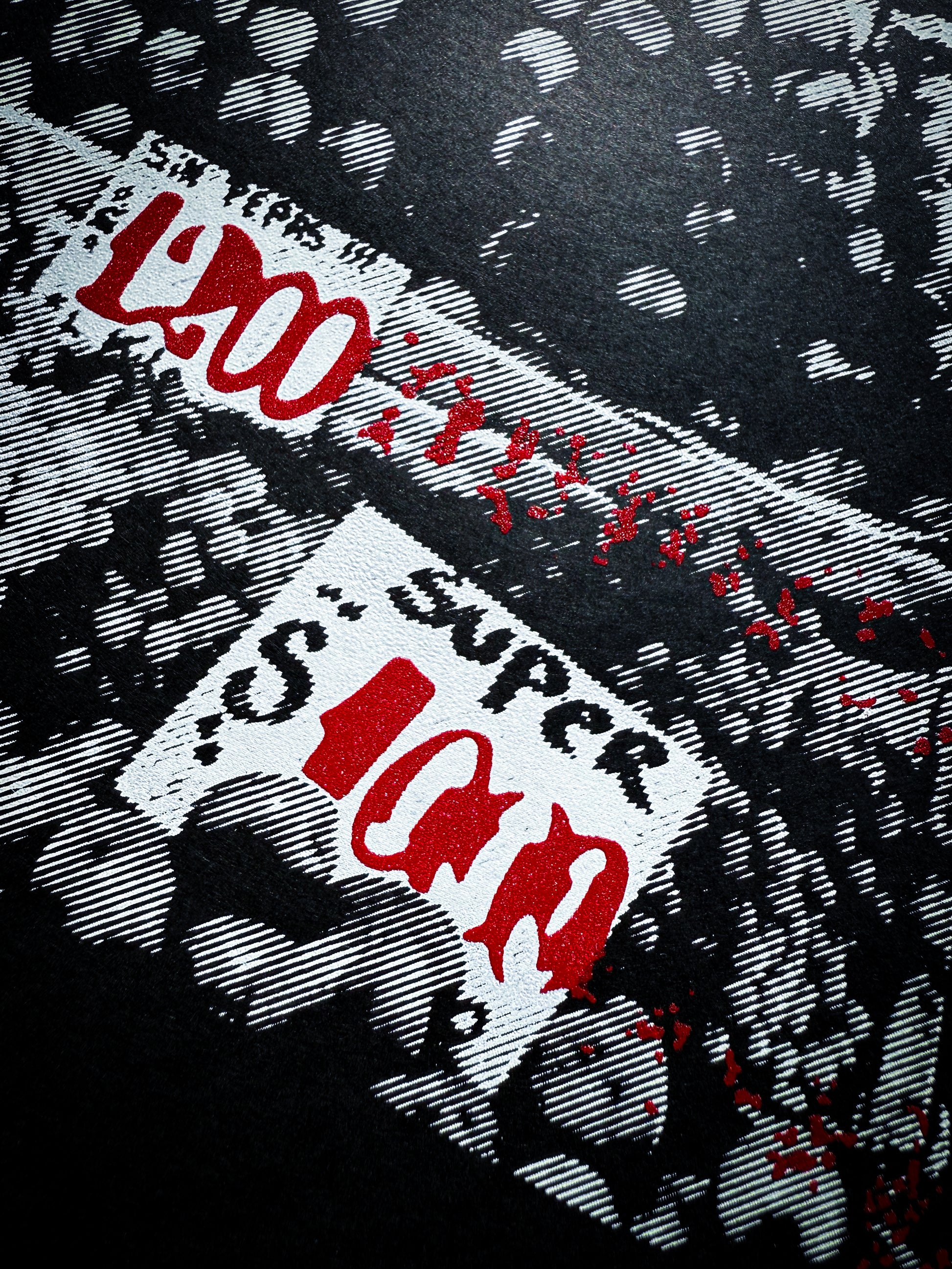 Three-color screen print (white, orange, and red) on black paper. Edition of 9 original pieces, hand-printed and signed.