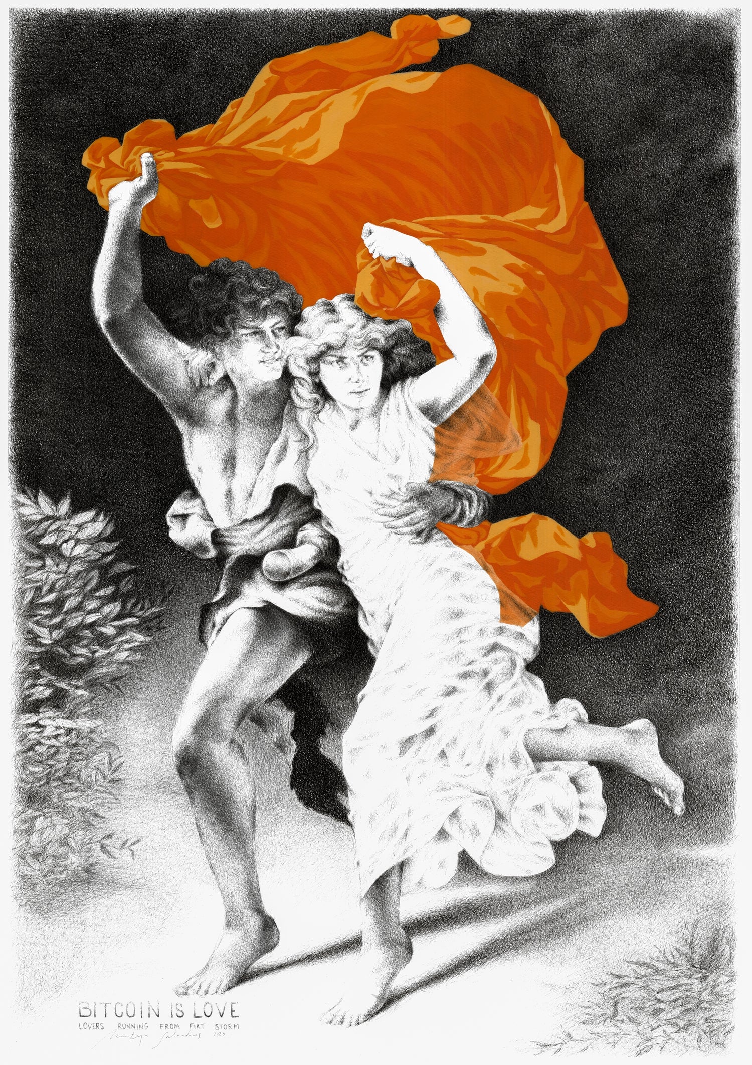 Inspired by the artwork: Bitcoin Is Love: Lovers Running From Fiat Storm. Made in Italy from pure silk and hand numbered, each foulard is a rare collectible, accompanied by a signed certificate of authenticity.